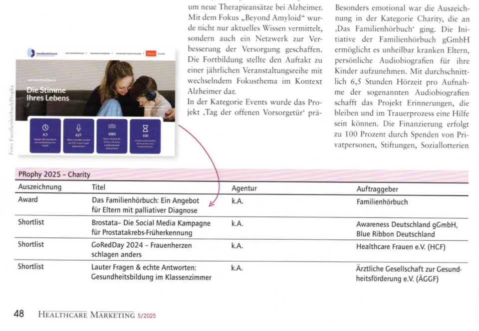 Die Familienhörbuch gGmbH wurde im Zuge der PRophy-Award-Verleihung auch in einem Fachmagazin für Gesundheitsmarken vorgestellt. Im „Healthcare Marketing Magazin“ gibt es Branchenwissen rund um Entwicklungen im Gesundheitsmarkt. Chefredakteurin Anna Jäger ging direkt am Abend der Awardvergabe (wir berichteten) mit dem Familienhörbuch ins Gespräch und bestärkte das Gesamtteam in seinem Wirken.